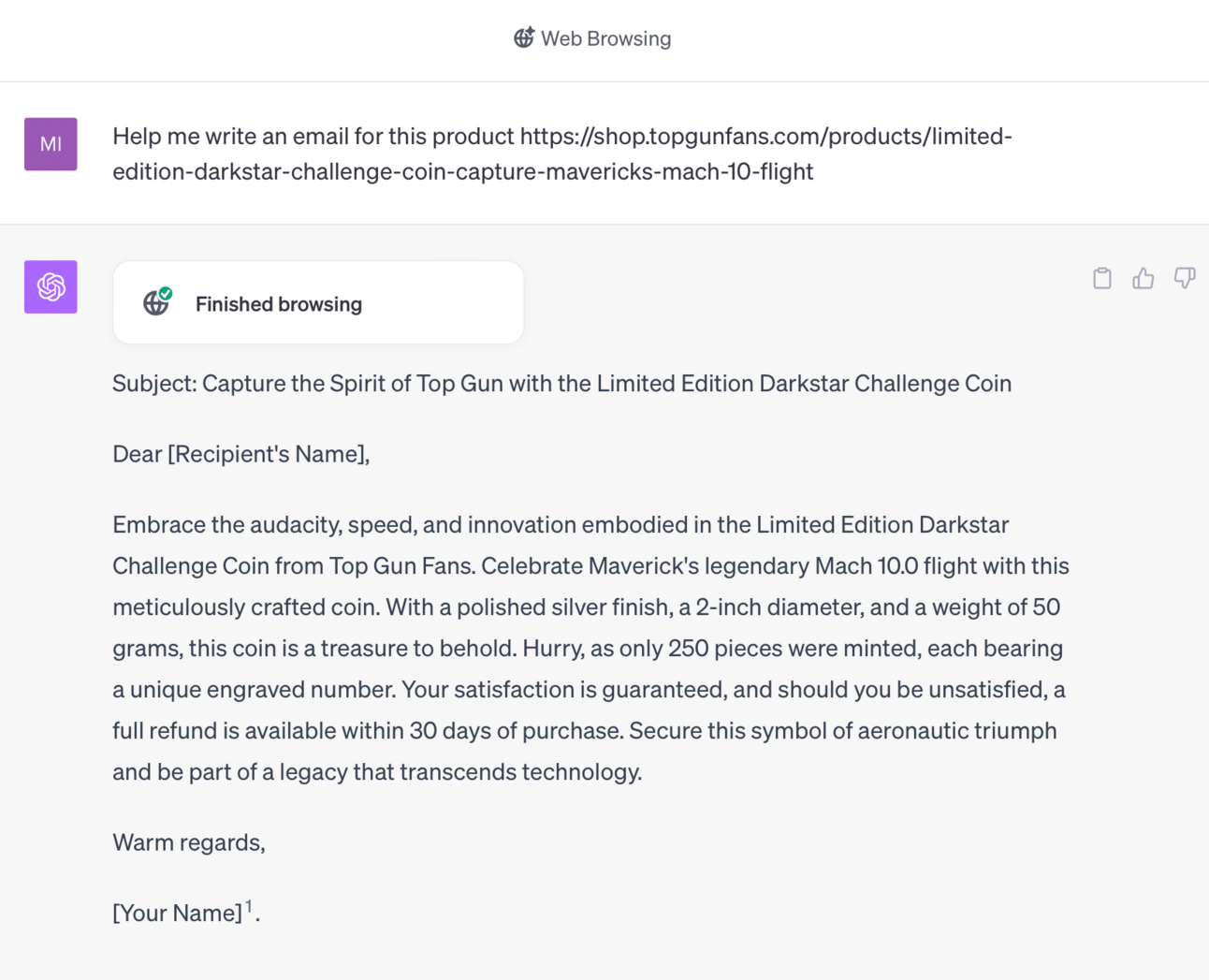In the second example, even though it accessed the product at my online store via the URL I gave it, the output was pretty much just the product description. There is no way I could send that out as an email and expect much in terms of results. I could have just copied and pasted the product description myself.