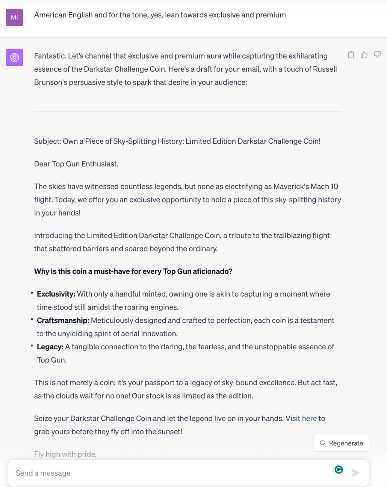Not only is the second output less personal, but it's also less conversational. It also didn't realize that Top Gun Maverick has already been released. The second version didn't use the style of Russell Brunson, a marketing style that works well. For the sake of comparison, I regenerated the response for both versions (with and without the Custom Instructions), and each time, the version that didn't use Custom Instructions referred to Top Gun Maverick as having yet to be released.