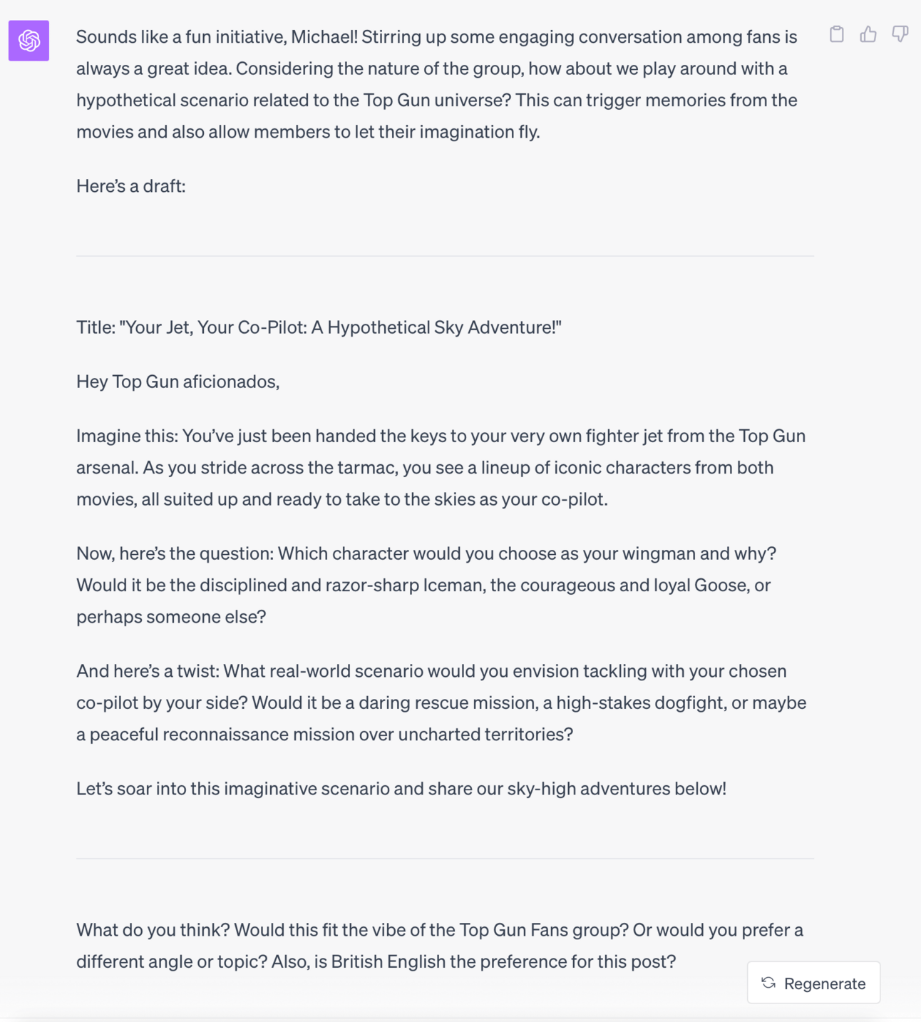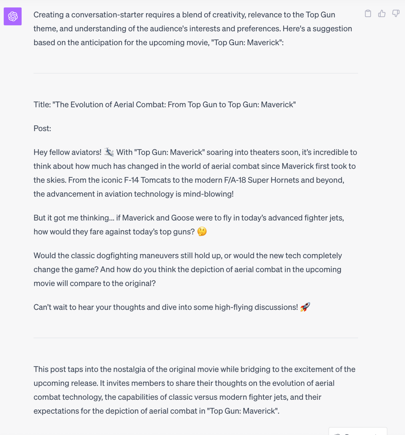 “I want to write a FB post for the Top Gun Fans FB group that will ignite/spark a conversation. You can choose the topic of the conversation.”